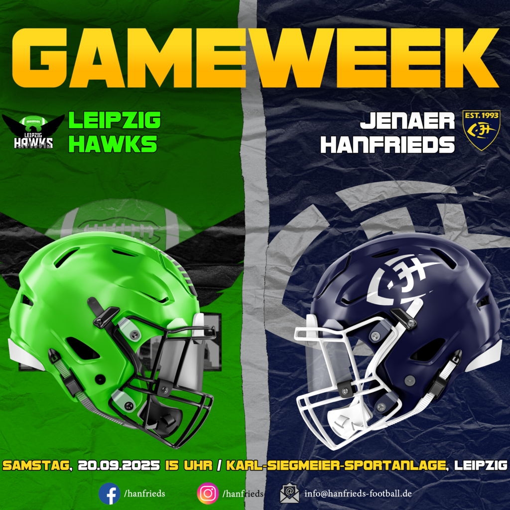 Die Hanfrieds starten heute in das vorletzte Training der Saison 2025 und somit in die letzte Gameweek des Jahres. Durch die aktuelle Konstellation der direkten Vergleiche (Jena, Görlitz und Leipzig) ist prinzipiell noch einiges möglich. So ist das Resultat entscheidend, ob die Hanfrieds das Jahr als 3., 4. oder 5. Platz beenden. Wir freuen uns auf eure Unterstützung in Leipzig. Let’s go Hanfrieds!