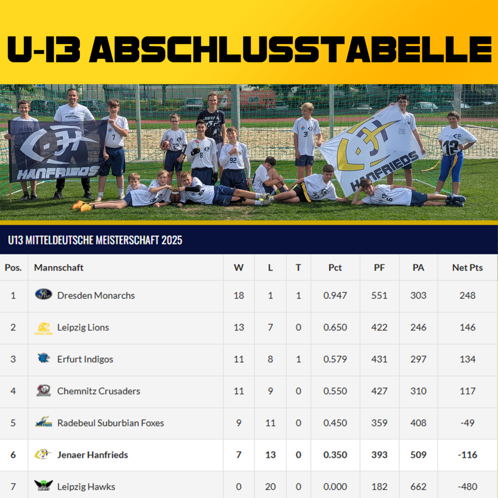 Am 27.09. treten die beiden besten Teams aus Thüringen (Jena & Werratal), Sachsen (Dresden & Radebeul) und Sachsen-Anhalt (Salzland & Magdeburg) noch im Finalturnier in Freiberg um die Mitteldeutsche Meisterschaft an. Ungeschlagen und als amtierender Vizemeister ist das Ziel klar definiert!