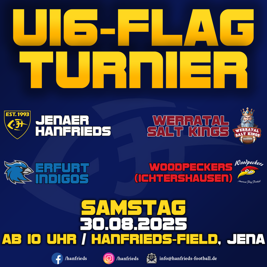 Am Samstag, den 30.08.2025, heißt es wieder Flag Football Action pur auf dem Hanfrieds-Field in Jena! 💛💙