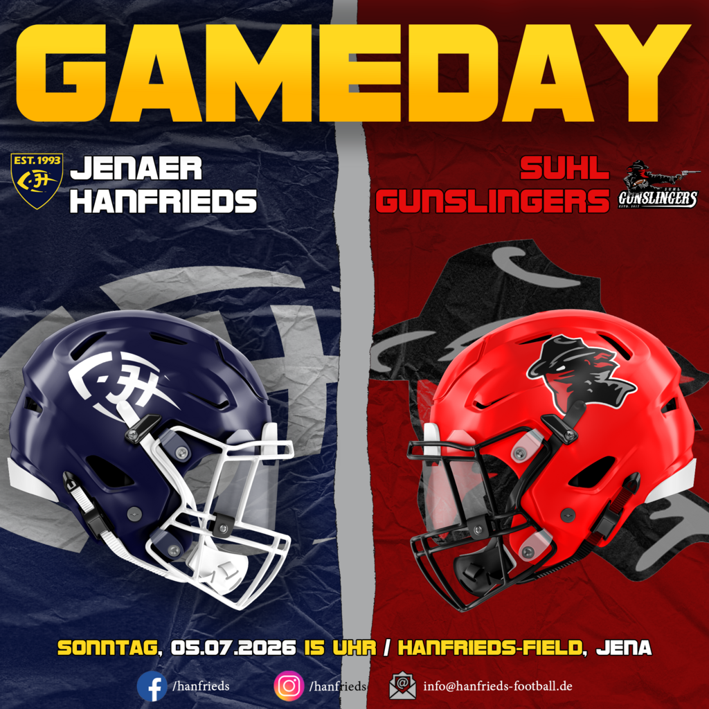Jenaer Hanfrieds vs Suhl Gunslingers Details Datum Zeit Liga Saison 5. Juli 2026 15:00 Oberliga Mitteldeutschland 2026 Austragungsort Hanfrieds Field im Sportpark Lobeda Alfred-Diener-Straße 2, 07747 Jena