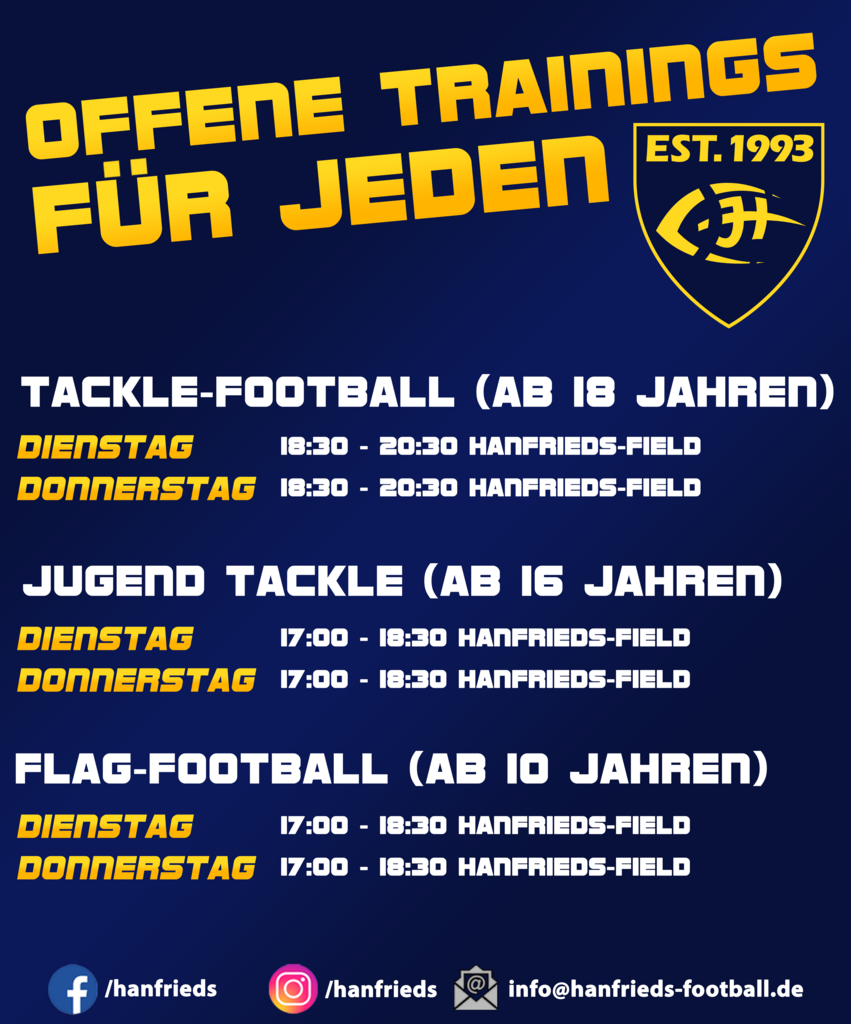 Nur noch zwei Tage bis zum ersten offiziellen Gameday der Saison 2024! Wir starten wie letztes Jahr mit einem Auswärtsspiel gegen die Salzland Racoons American Football. Letzte Saison konnten wir dabei beide Matches gegen sie gewinnen – ein gutes Omen? Das ist nur schwierig zu beurteilen. Aus der Ferne konnten wir beobachten, dass sich die Salzländer stark entwickelt haben. Mit einem neuen Head Coach und einer starken Offseason mit zahlreichen prominenten Gastcoaches im Gepäck, werden die Racoons uns einiges abverlangen und optimal vorbereitet sein. Demnach heißt es für die Hanfrieds, heute ein letztes solides Training abzuliefern und am kommenden Samstag fokussiert in die Saison zu starten. Wir erwarten ein knappes, faires Duell vor einer tollen Kulisse, angeheizt von den Red Racoons Cheerleadern und freuen uns auf das erste Spiel der Saison 2024! Ihr wollt uns spontan auch bei einem Auswärtsspiel unterstützen? Ob als Helfer oder Fan, meldet euch bei uns – gemeinsam bringen wir die Hanfrieds zum Sieg, auch im salzigen Land der Waschbären! Let’s Go Hanfrieds! ![]()